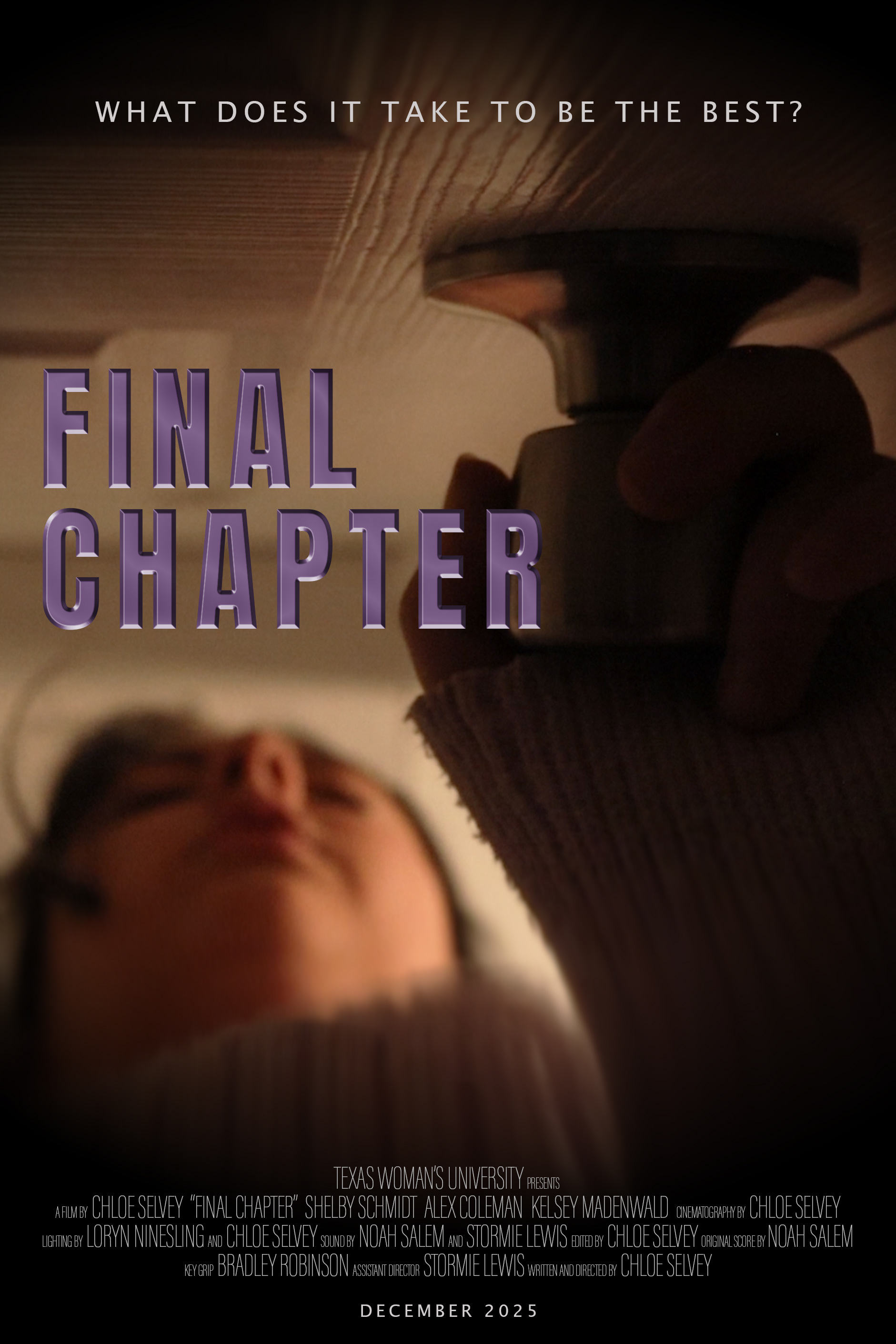 FINAL CHAPTER is a short film dealing with themes of paranoia and imposter syndrome. Iris, the main character, is unconfident in her own work and haunted by a figure that only she can see. As her uncertainty grows, so do the appearances of the figure, despite being repeatedly reassured. Eventually, her drive for perfection leads her down a path with no return. Iris’ story is a reflection of my own experiences with anxiety and self-doubt. Throughout the short, there is a heavy focus on production design and mise-en-scene. The background colors are purposefully kept dull and warm for the majority of the film, making Iris’ purple clothing and the figure’s red eyes pop. I was very intentional with the colors I chose, purple being the color of transformation and misfortune to come, red being the color of power and defiance. I had several inspirations when writing the story and creating the visuals for Final Chapter, most notably The Twilight Zone (1959-64), The Shining (1980), Sixth Sense (1999), and the book If It’s Purple, Someone’s Gonna Die by Patti Bellantoni.